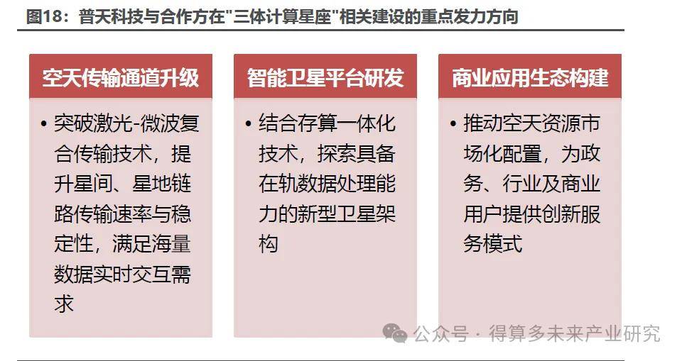 三体计算星座目前已经在空天计算领域形成了良好的生态,之江实验室和普天科技、国星宇航、氦星光联等多个合作方合作,共同推动三体计算星座的快速发展。1)三体计算星座计划构建一个覆盖全球的太空计算网络,通过星间激光高速互联、星座稳定组网、算力分布式调度,让数据在空中实时传输、运算,即时传回地球,打造开放共享的太空计算系统,构建天基智能计算基础设施,为未来的高级太空活动提供天基计算服务及大规模实时协同支持。2)之江实验室的两大重要参与者是浙江大学和阿里巴巴。中国工程院院士、全国政协委员、之江实验室主任、阿里云创始人王坚博士表示,人工智能跟制造业的结合是新的产业,将人工智能和航空航天产业结合则是发展的重要目标。