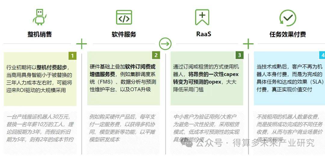 一次性整机销售是目前具身智能主要的商业模式,同时辅以部分的软件服务销售。展望未来,具身智能的商业模式可能将从传统的纯硬件整机销售,逐步演进为降低客户前期投入的“机器人即服务(RaaS)”模式,最终发展至与客户业务价