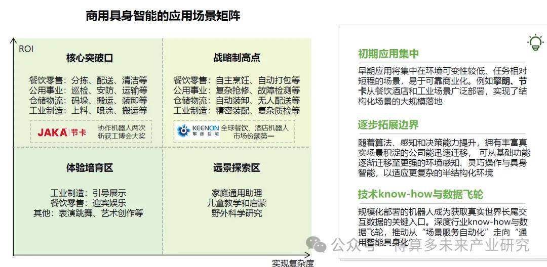 具身智能的商业化正沿着价值阶梯演进。当前,产业应用以高ROI、低复杂度的“确定性”场景为核心突破口,如工业制造、仓储自动化和餐饮零售的基础场景正迎来订单加速释放期。未来,随着技术成熟度提升,应用将向高复杂度、高价值的“战略性”场景渗透,最终实现通用化服务,开启更广阔的市场空间。
