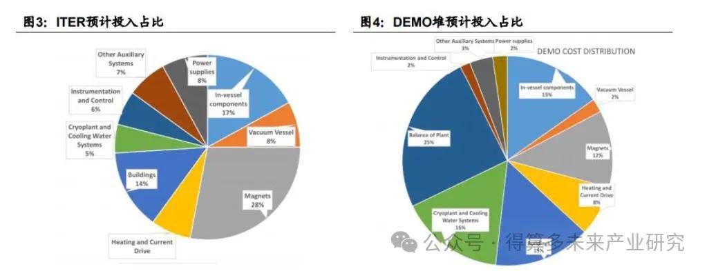 托卡马克主要由环形真空室、磁体和其他辅助设施组成,具有结构简单、造价低,生产周期短,装置迭代快,以及加热成本低等优势,是目前各国投入最大、最接近可控核聚变条件、技术发展最成熟的途径,约占全球核聚变装置的50%。磁体由制冷机、低温恒温器、圆筒骨架、超导线图、失超保护模块、超导开关、磁屏蔽铁轭等构成。超导磁体的制备需要将超导带材绕成线圈,并且控制绝缘、应力、传热、冷却,做成磁体。根据《Superconductors for fusion:a roadmap》(Neil Mitchell et al),ITER与DEMO项目的成本分布: