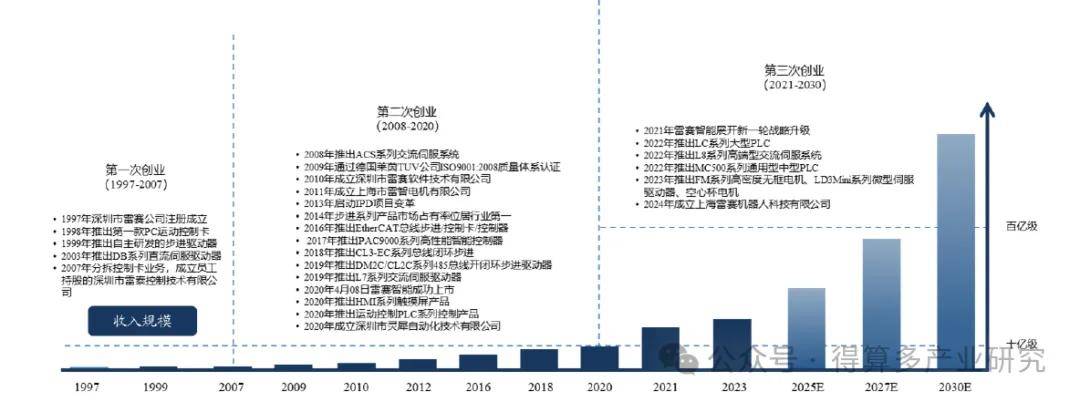 成立于1997年,雷赛智能专注于为智能制造装备业提供运动控制核心部件及行业运动控制解决方案,产品覆盖了运动控制主要领域。1998年推出第一款PC运动控制卡,1999年推出自主研发的步进驱动器,并不断丰富产品线。2003年,公司开始持续投入伺服系统研发,先后推出DB、DCS、ACS系列等产品。2007年后,公司BLM系列电机产品实现量产,2012年推出智能一体式电机,目前公司产品进入智能化总线化阶段,2019-20年分别推出交流伺服L7/L8系列,并布局了运动控制型PLC等产品。2021-22年,完成组织变革初步构建“平台型”经营管理体系,创新高端产品线。2023-24年,打造“移动机器人”辅赛道,持续推进人形机器人核心零部件研发和量产,开启第三次创业。