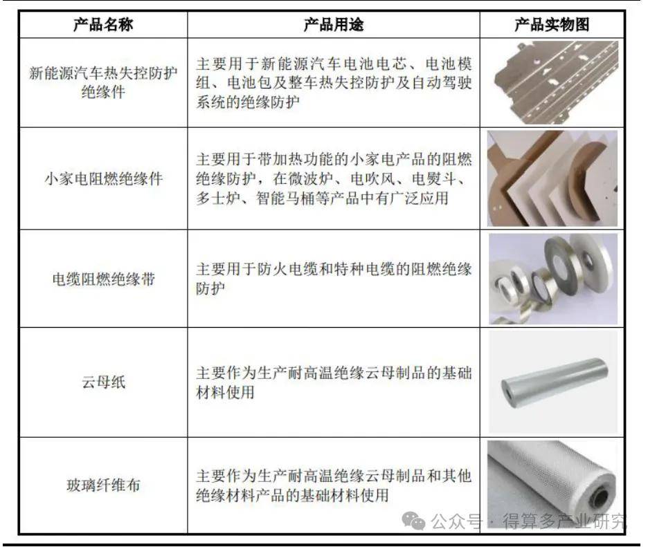 公司主营业务为各类耐高温绝缘云母制品的研发、生产和销售,主要在新能源汽车、小家电、电线电缆等下游行业应用。2003年公司正式成立,专注于耐高温绝缘云母制品的研发、生产和销售,2005年公司通过ISO 9001质量管理体系认证,2013年公司开始研发新能源汽车防火安全件,2018年公司开始为各大车企定制新能源汽车热失控管理解决方案,目前已成为特斯拉、大众、宝马、沃尔沃新能源汽车热失控防护绝缘件主要供应商,公司被沃尔沃评选为“2021年度最佳供应商”,2022年被沃尔沃授予“质量卓越奖”。2023年公司在上交所上市。