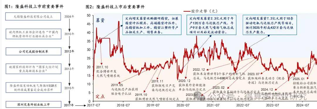 公司成立于2004年,上市前聚焦发动机废气再循环EGR系统业务,2016年柴油/汽油EGR市场占有率分别达38.5%/17.8%。上市后通过收购微研精密拓展精密零部件加工业务,并利用上市公司的融资优势扩展马达铁芯等核心产品产能,混动乘用车EGR等业务持续获取新定点,主业成长动能强劲。前瞻布局商业航天、人形机器人领域,铸造第三成长曲线。