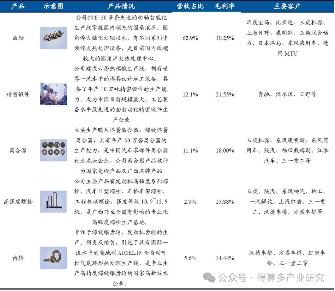 公司产品矩阵丰富,主力产品为曲轴。公司产品布局涉及曲轴、离合器、精密锻件、齿轮、螺栓等,产品覆盖汽车、工程机械、农机、船舶等多个领域。而公司业务以曲轴为主,拥有30多条先进的曲轴智能化生产线,拥有国内领先的圆角滚压、圆角淬火强化处理技术,是国内混动曲轴龙头企业。近年来,新能源汽车发展迅速,电驱动系统中高精密齿轮部件是驱动电机的重要部件。伴随新能源汽车渗透率不断提高,高精密齿轮需求持续扩大。2024年以来,人形机器人产业爆发,高精度齿轮传动系统作为精密减速器核心部件需求旺盛。综合来看,发展高精密齿轮有助于公司实现战略转型,培育新的利润增长点,是公司未来发展重点。