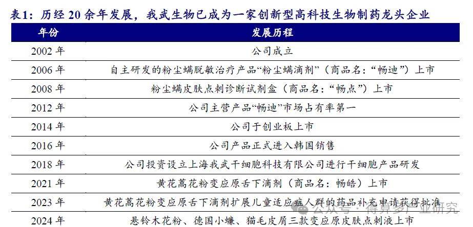 我武生物,创立于2002 年,主要从事变应原制品的研发、生产和销售业务,专注于研发各类脱敏治疗药物和诊断试剂,在变应原制品领域取得了一系列核心技术。