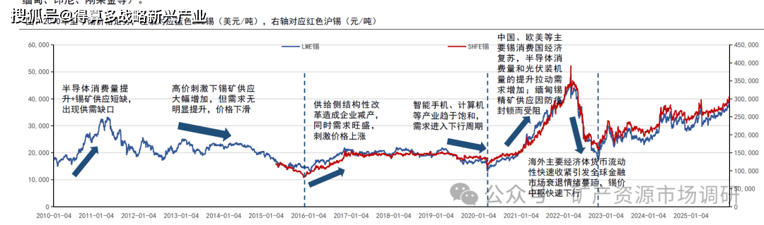 • 2022.11至今:美联储从加息,到加息节奏放缓,再到降息,货币环境逐渐宽松。同时,国内疫情管控政策放开,进一步刺激锡价上涨。供给端扰动不断(秘鲁、缅甸、印尼、刚果金等)。