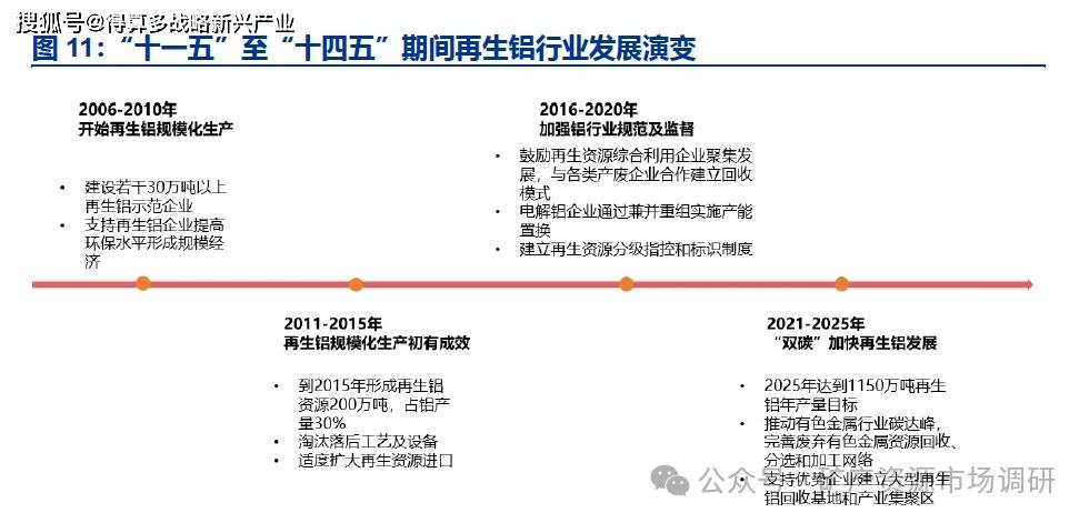 支持政策持续发布。在环境保护及节约能源背景推动下,循环经济逐渐发展成为我国重要的经济形式,自 2006 年“十一五”时期开启以来,全国人大、中共中央、国务院、发改委以及工业和信息化部针对再生资源综合利用颁布一系列政策,大力支持再生铝行业发展。随着再生铝产业规模化、装备技术现代化速度不断加快,再生铝有望替代电解铝成为我国铝消费的主要供应来源。“十一五”至“十四五”期间,我国涉及再生铝行业的国家政策大体上经历了四个演变发展阶段。