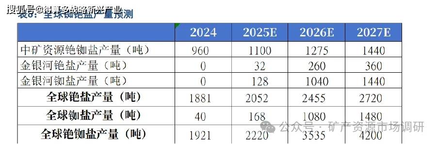 铷铯盐供给扩张将有效满足下游产品消费结构升级及新型需求爆发。从企业端扩产计划观察,全球铷铯盐供应主要有两大新增变量。一是现铷铯资源龙头中矿资源扩张 Bikita 铯榴石采选线,预计于 2025年底投产后将公司铷铯盐产能由 1000 吨升至 1500 吨(主要为铯盐产能),我们预计该批产能或于 2027 年逐渐达产:二是金银河凭借其锂云母绿色高值全元素提取项目,在锂云母提锂生产中可提取副产品铷铯盐,根据其已建成的1万吨锂云母产能测算,若于2027 年达产,达产后铯盐产量或达 450 吨,铷盐产量或达 1700 吨。综合观察,企业的扩产或推动全球铯供给由 2024年的 1881 吨升至 2027 年的 2811 吨,期间 CAGR 达 14%:全球钕供给或由 2024 年的 40 吨升至 2027 年的 1740 吨。长期以来,铷铯上游生产商已对铷铯价格形成较强议价权,且产量往往决定了下游需求量。由于本轮铷铯扩产仍由寡头企业推动,因此实际的销量增长或取决于市场需求在更高供给上限下的扩张情况,上游生产商的议价能力将帮助铷铯价格在供给增长的情况下形成稳定有效的动态调节。铷铯盐现有消费结构的升级(原子钟、离子推进器等高科技领域铷铯盐需求或持续发展)以及新兴需求(钙钛矿太阳能电池等场景对铷铯应用的发掘)的爆发或推动铷铯需求快速上行。此外,铷盐市场在低供给高价格的情景下目前需求量较低,因此铷供给端生产工艺改善推动供给量提升或帮助铷盐市场需求有效外扩。