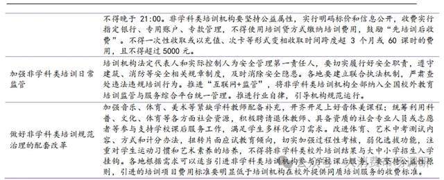 打击隐形变异培训,对非学科类培训影响亦大。2022 年 11 月 30 日,教育部等十三部门印发《关于规范面向中小学生的非学科类校外培训的意见》,主要内容包括:1)明确非学科类培训机构设置标准、人员资质、日常规范。不得聘用中小学在职在岗教师,线下培训结束时间不得晚于 20:30,线上不得晚于 21:00,不得一次性收取时间跨度超 3 个月或 60课时的费用,且不得超过 5000 元。2)各地建立联合执法机制,推进“互联网+监管”。将非学科类培训机构全部纳入全国校外教育培训监管与服务综合平台统一管理,严厉打击违法行为。3)强化学校教育主阵地,公益性引进非学科类培训服务。补充校内素质教育资源配备,支持各地适当引进非学科类培训机构参与学校课后服务,但费用标准须明显低于培训机构在校外提供同质培训服务。但此时学科类与非学科类之间的划分与界定无统一标准,正规非学科类培训仍受影响。