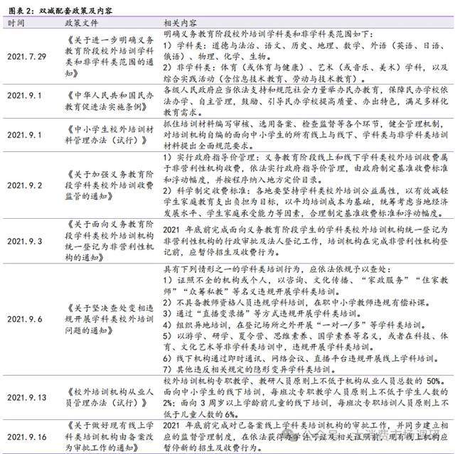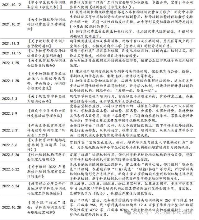 充。①我国教育政策分为两条主线:规范义务教育阶段校外培训发展,从初步探索到强力管控再到分类管理,支持非学科类发展,主旨始终不变即为学生减负并促进全面发展;支持职业教育发展,培养高素质劳动和技术技能人才。②展望:规范校外培训机构,鼓励非学科类校外培训。