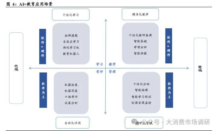 AI+教育的主要应用场景在 B 端围绕教学与管理、在 C 端围绕学习与考评。AI+教育 B 端市场的主要玩家是传统教育信息化厂商,具备技术研发实力,而主流教育公司的优势在于教研体系、多年积累的品牌认知及口碑生源,在 AI+教育 C 端市场具备拓展潜力。B 端应用聚焦精准化教学与科学化管理,面向学校、教育机构,覆盖学前教育、基础教育、职业教育、高等教育四大应用场景。在教学层面,通过软件+硬件实现个性化教研备课、智能答疑、学情分析、智能助教;在管理层面,以软件为主,涵盖个性化分班、智能排课、智能学习规划、校园安保监控。C 端应用致力于实现学生端的个性化学习与教学端的自动化评阅,面向学习者,学习场景借助软件+硬件,开展拍照搜题、自适应学习、游戏学习机、教育机器人应用,考评场景目前以软件为主,实现机器组卷、机器阅卷、口语考评、试卷分析,当前学习机已经成为承载个性化学习和自动化评阅功能的主流 C 端应用载体。