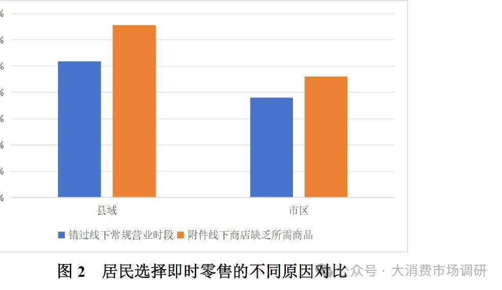 二是县域即时零售消费意愿增强。据美团研究院的即时零售消费习惯问卷调查显示(2023 年8 月),在县域,因为“附近线下商店缺乏所需商品”和“错过线下常规营业时段”而选择即时零售消费方式的消费者的占比分别达到32.8%和25.9%,均高于市区居民的占比(见图2)。