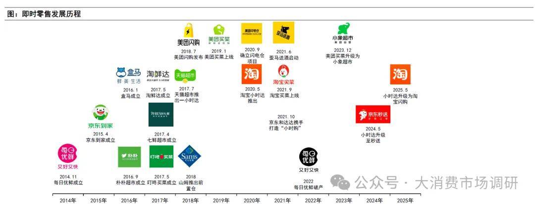 • 发展历程:2015年前后,随着智能手机普及度提升,LBS成为可能,各家公司纷纷开始布局近场零售,随后涌现出大量的即时零售商业模