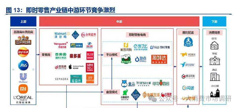 即时零售产业链分为上游源头供应、中游撮合成交、下游到家交付三个环节,业内竞争集中于中游。具体来看,即时零售产业链主要包括商品供给、商品成交和履约交付三个环节,以此为基础将整个产业链分为上中下游三个部分。与传统商品零售产业链相比,即时零售最大的特点在于电商平台的加入为商品交易铺设了即时到家的路径,从流量集合、在线交易支持、履约配送等方面赋能线上流量的线下转化。随着产业链的不断整合优化,不同环节参与者之间的界限逐渐模糊,部分强势企业通过整合上下游资源形成横跨多种商业模式的“超级平台”,构筑起了较深的护城河。在当前众多大厂纷纷加速布局即时零售赛道的背景下,预计未来行业内激烈的存量竞争仍将持续。