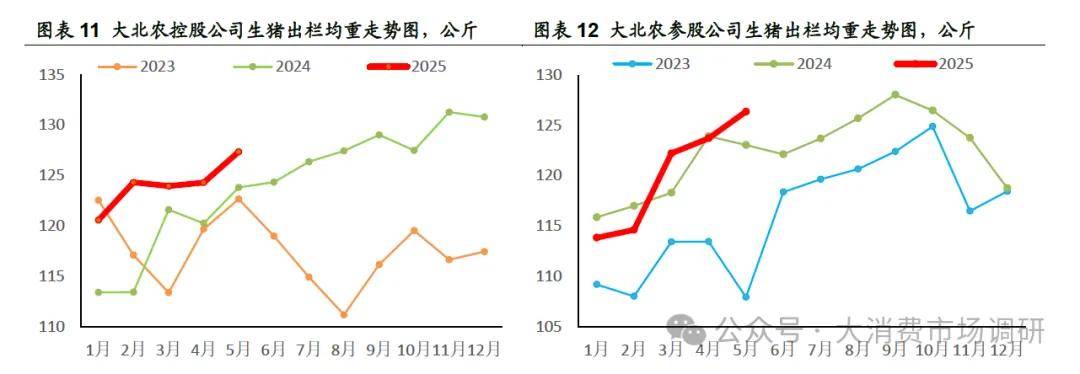 ① 大北农控股公司的生猪出栏均重处于2023年以来同期最高水平,2025年5月出栏均重达到127.36公斤,较2023、2024年同期分别增长4.7公斤、3.54公斤;