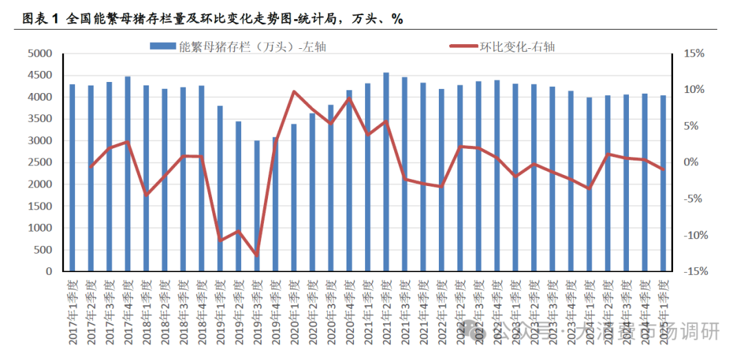 ② 2025年3月末,温氏的能繁母猪存栏量185万头,较2024年末增加约11万头,2025Q1全国能繁母猪存栏量下降39万头。 综上,大型集团猪企若产能扩张受限,全国能繁母猪存栏量有望步入下行通道。大型集团企业也将更多聚焦于种群优化、提升PSY等生产效率指标。