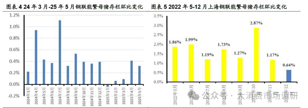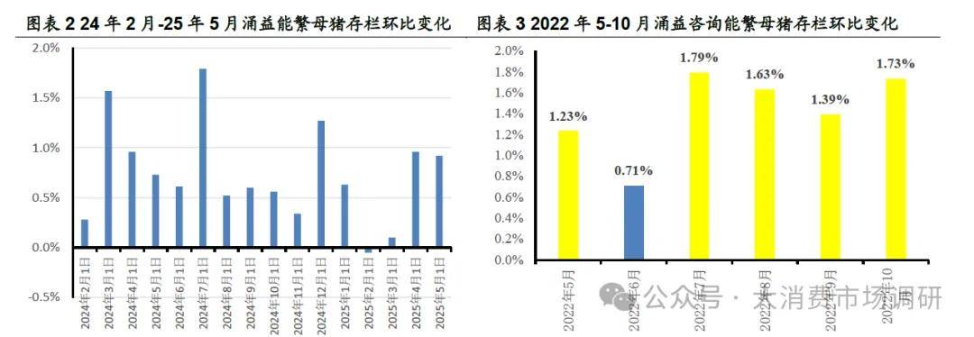 从行业数据看,2024年2月-2025年5月,涌益咨询能繁母猪存栏量累计增幅11.79%;2024年3月-2025年5月,上海钢联能繁母猪存栏量累计增幅5.9%。
