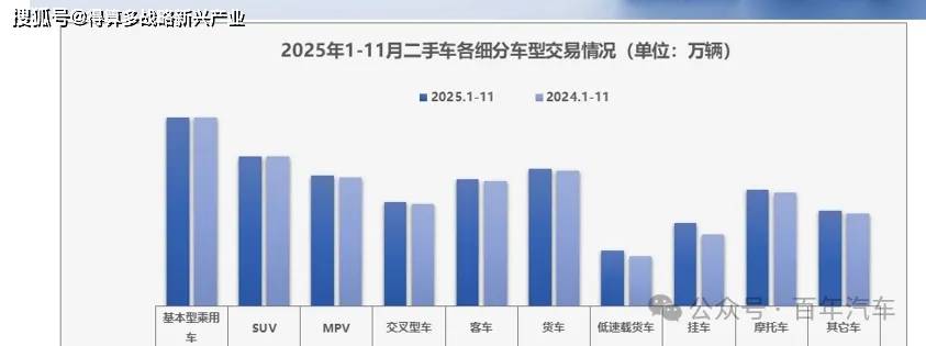 2025年1-11月,二手车累计交易量1823.69万辆,同比增长2.95%。乘用车累计交易1429.40万辆,同比增长0.97%。其中:基本型乘用车累计交易1023.22万辆,同比增长0.15%;SUV共交易239.76万辆,同比增长0.49%;MPV共交易121.12万辆,同比增长7.55%;交叉型乘用车共交易45.29万辆,同比增长6.05%。