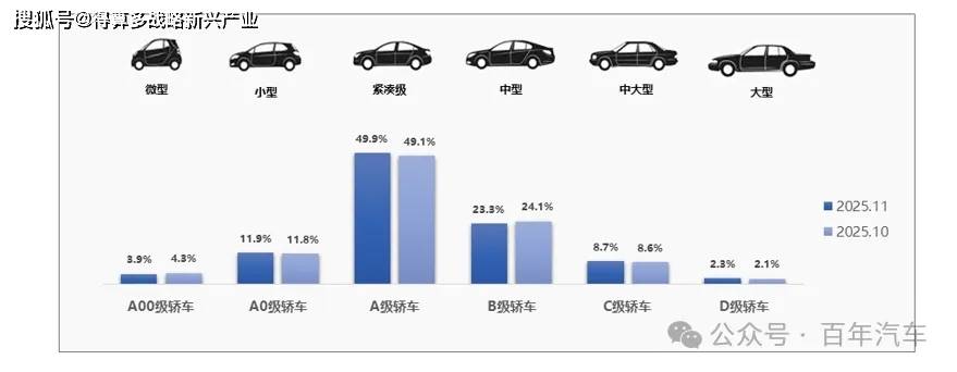 2025年11月,各级别轿车的整体销量来看,A级轿车依旧是最热销的车型,占比为49.9%,环比增长0.8个百分点;其次是B级轿车占23.3%,环比下降0.8个百分点;C级轿车占8.7%,较上月增长0.1个百分点;D级轿车占2.3%,较上月增长0.2个百分点;A0级轿车占11.9%,环比增长0.1个百分点。A00级轿车占3.9%,环比下降0.4个百分点。11月份,轿车市场中,B级和A00级车型的交易份额较上月有所减少,A级轿车的占比增长明显。