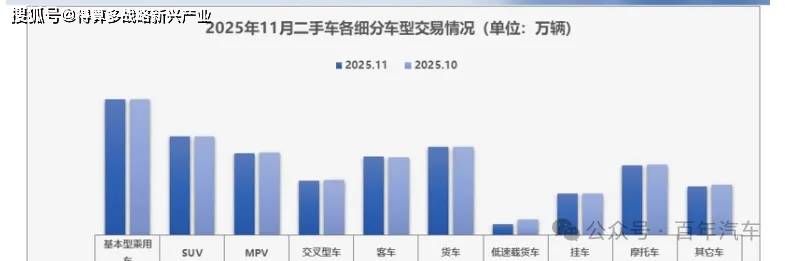 2025年11月,全国二手车市场交易量174.62万辆,环比下降0.67%。基本型乘用车共交易96.71万辆,环比下降0.25%,同比下降5.07%;SUV共交易22.71万辆,环比下降0.42%,同比下降6.37%;MPV共交易11.75万辆,环比下降2.25%,同比增长2.79%。商用车情况:客车共交易10.24万辆,环比增长0.39%,同比增长4.40%;载货车15.15万辆,环比下降1.18%,同比增长4.50%。
