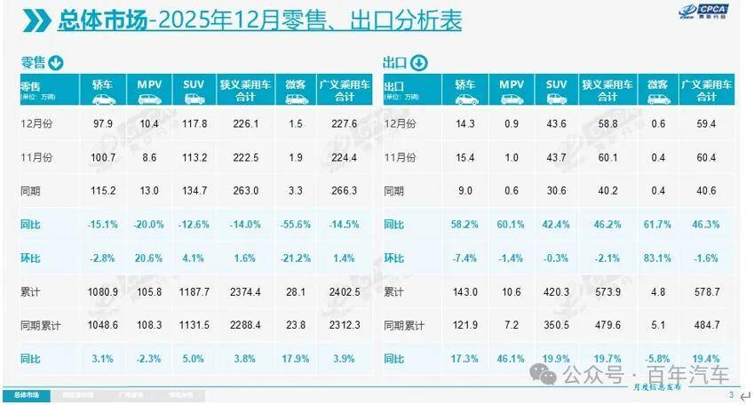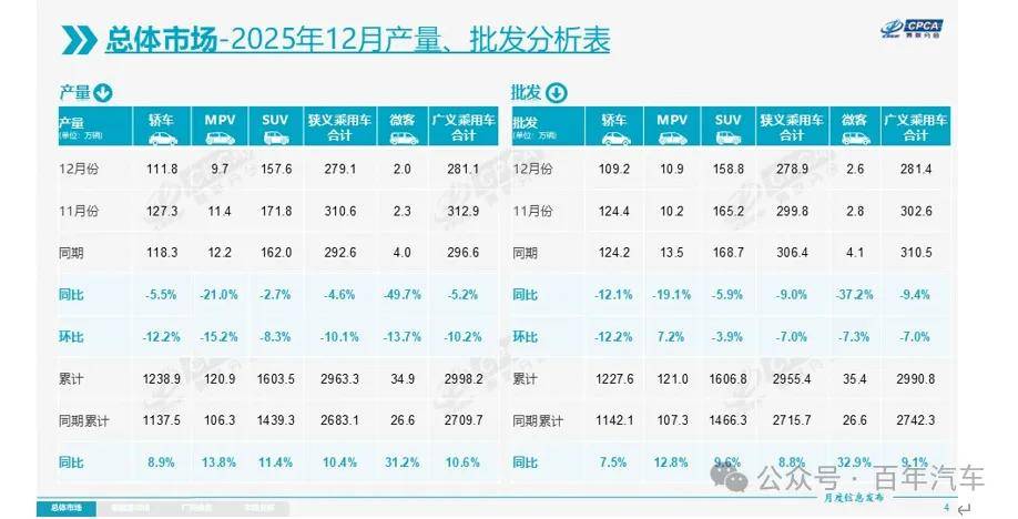 2025年12月乘用车市场产量、批发量、零售量、出口量数据统计