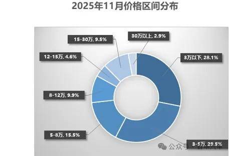11月,二手车交易价格区间在3-5万元的车辆市场占比最大,占29.5%,环比增长3.4个百分点。其次是3万以内的车辆占28.1%,环比下降3.4个百分点;5-8万占15.5%,环比下降2个百分点;8-12万区间较上月增长0.2个百分点;12-15万区间较上下降0.8个百分点;15-30万和30万以上两个区间较上月分别增长9.5个百分点和2.9个百分点。从价格分布上看,11月份,15万以上价格区间的占比较上月整体有所增加,3万以内和5-8万价格区间的占比较上月有所减少。