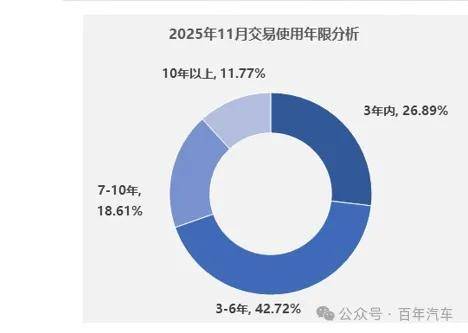 11月,二手车使用年限在3-6年的交易占比最多,占42.72%,环比下降0.11%,较去年同期下降7.12%;使用年限在3年内车型占26.89%,环比增长0.63%,较去年同期增长0.28%;车龄在7-10年的型占18.61%,环比下降1.61%,较去年同期增长2.59%;车龄10年以上的车型占比为11.77%,环比增长1.10%,较去年同期增长4.25%。