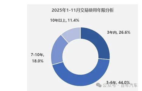 1-11月,二手车使用年限在3-6年的交易量最多,占比为44%,较去年同期下降3.5个百分点;使用年限在3年内车型占比为26.6%,较去年同期增加了0.2个百分点;车龄在7-10年的车型占比为18%,较去年同期增加了0.6个百分点;车龄10年以上的车型占比为11.4%,较去年同期增加了2.7个百分点。