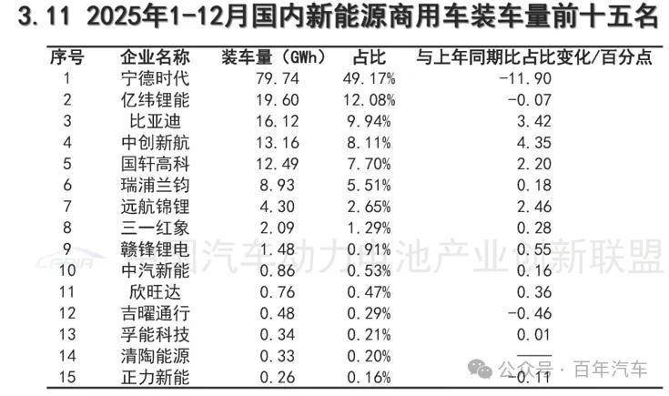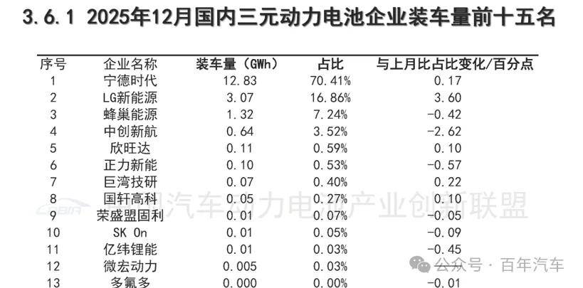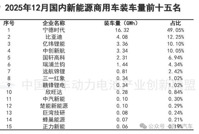 12月,动力电池销量同比增长49.2%,宁德时代、中创新航、欣旺达、瑞浦兰钧、中汽新能、因湃电池等均超过平均增长速度。