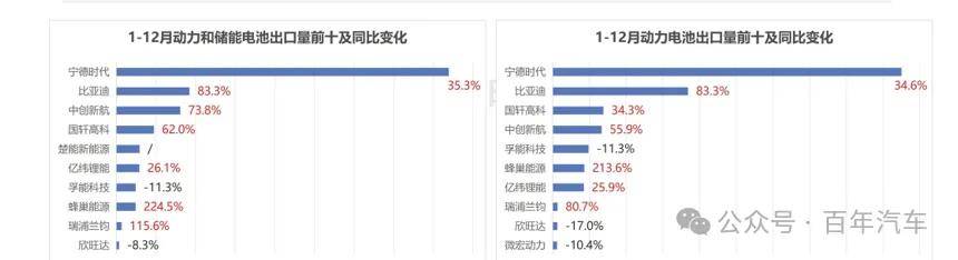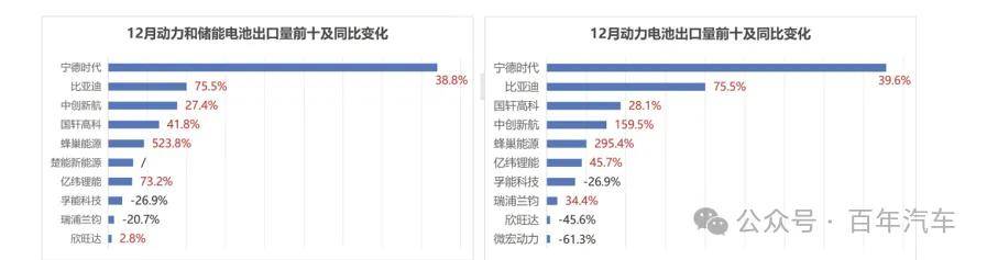 1-12月,动力和储能电池出口累计同比增长50.7%,比亚迪、中创新航、国轩高科、蜂巢能源、瑞浦兰钧等超过平均增速。