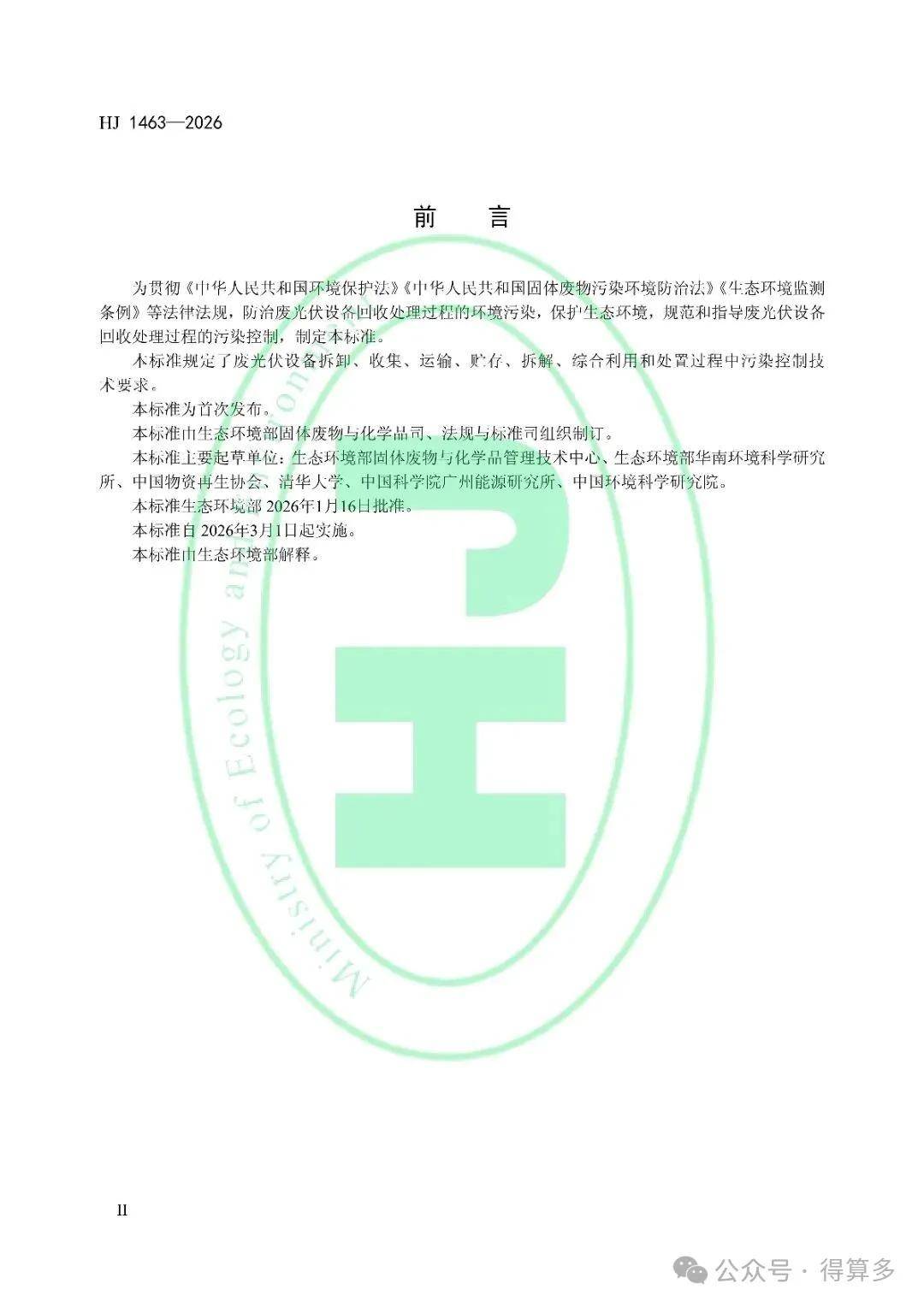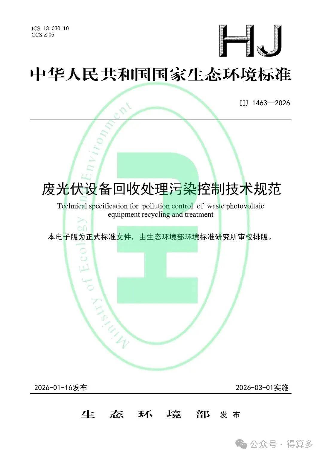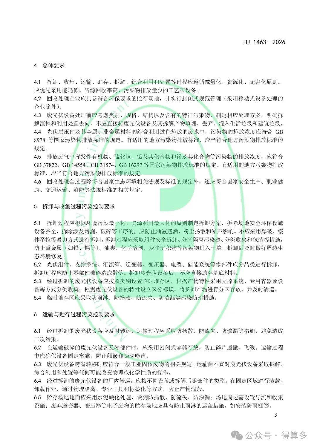 为贯彻《中华人民共和国环境保护法》《中华人民共和国固体废物污染环境防治法》《生态环境监测条例》等法律法规,防治废光伏设备回收处理过程的环境污染,保护生态环境,规范和指导废光伏设备回收处理过程的污染控制,制定本标准。本标准规定了废光伏设备拆卸、收集、运输、贮存、拆解、综合利用和处置过程中污染控制技 术要求。本标准为首次发布。