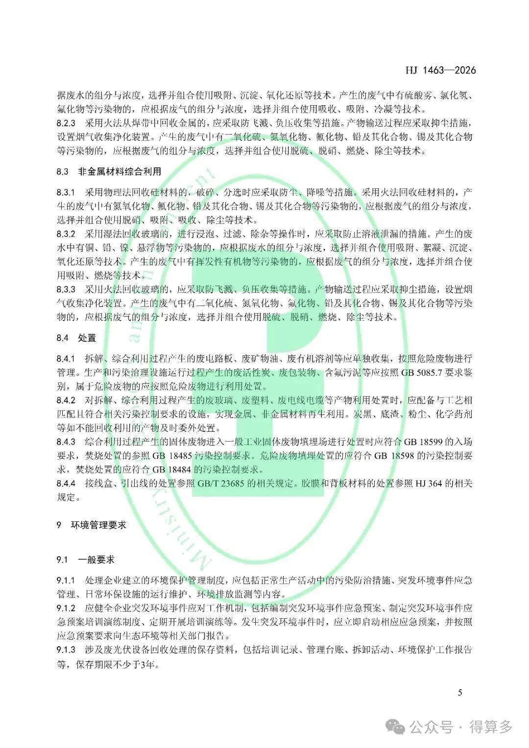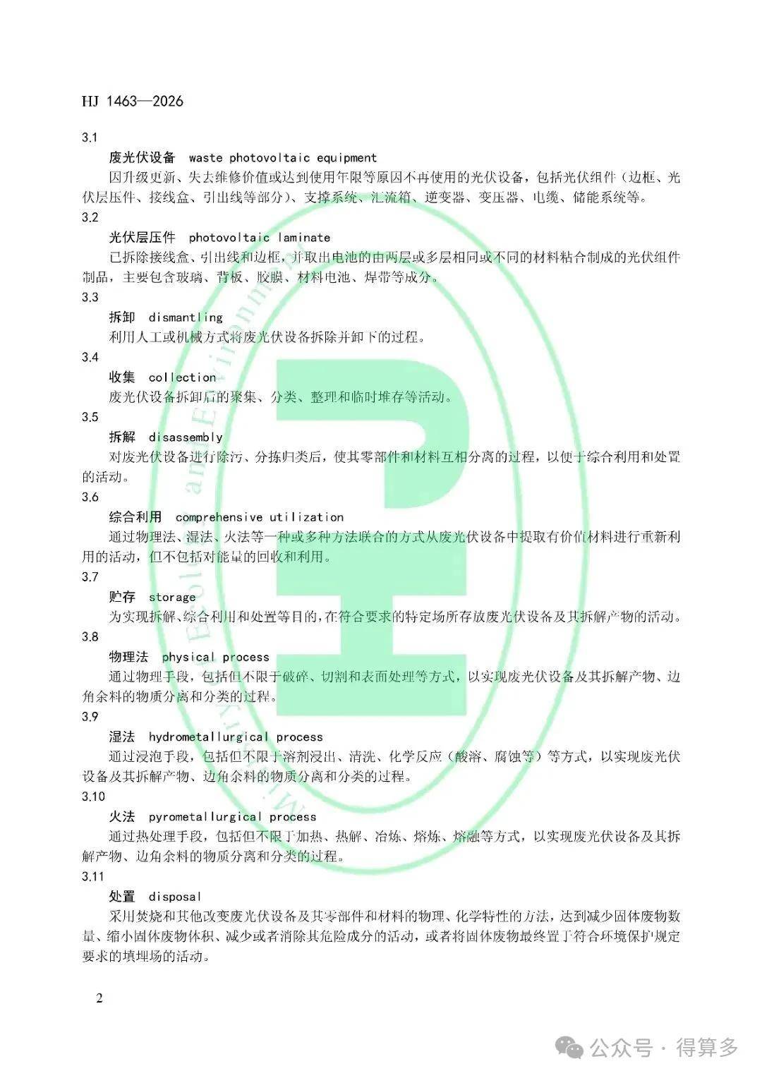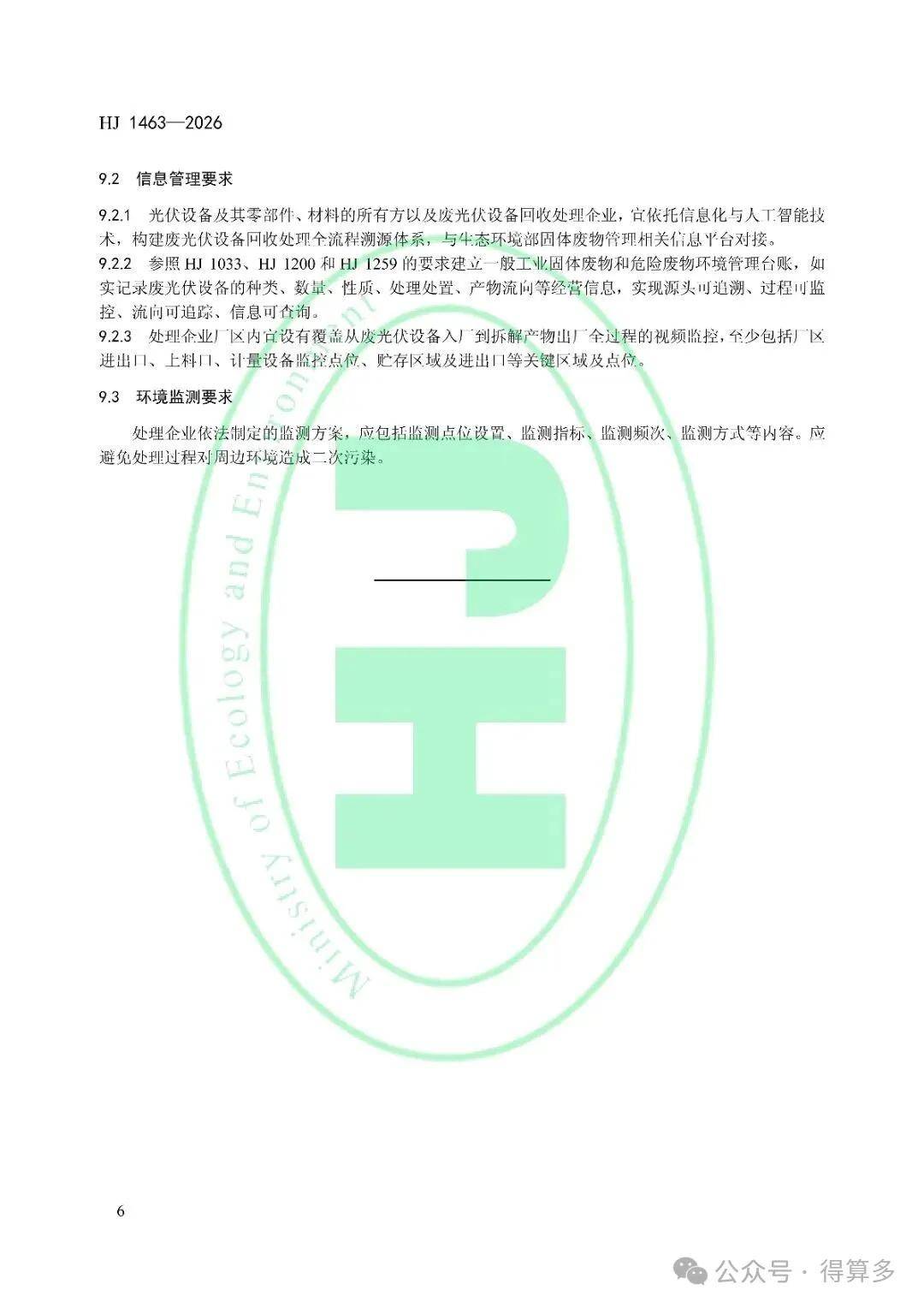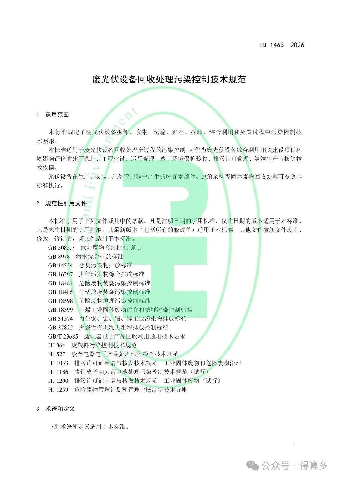 为贯彻《中华人民共和国环境保护法》《中华人民共和国固体废物污染环境防治法》《生态环境监测条例》等法律法规,防治废光伏设备回收处理过程的环境污染,保护生态环境,规范和指导废光伏设备回收处理过程的污染控制,制定本标准。本标准规定了废光伏设备拆卸、收集、运输、贮存、拆解、综合利用和处置过程中污染控制技 术要求。本标准为首次发布。